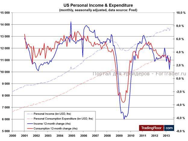 Ожидается, что личные доходы в июне выросли на 0,5%, то есть темпы по сравнению с маем не изменились. Личное потребление снижается уже на протяжении двух лет, однако в свете улучшения условий в сфере занятости, а также показателей доходов и потребительских настроений есть основания полагать, что расходы в скором времени восстановятся. Это будет иметь большое значение для экономики. На сегодняшний день расходы растут уже пару месяцев, и в июне ожидается очередной прирост на 0,5% по сравнению с майским показателем на уровне +0,3%.