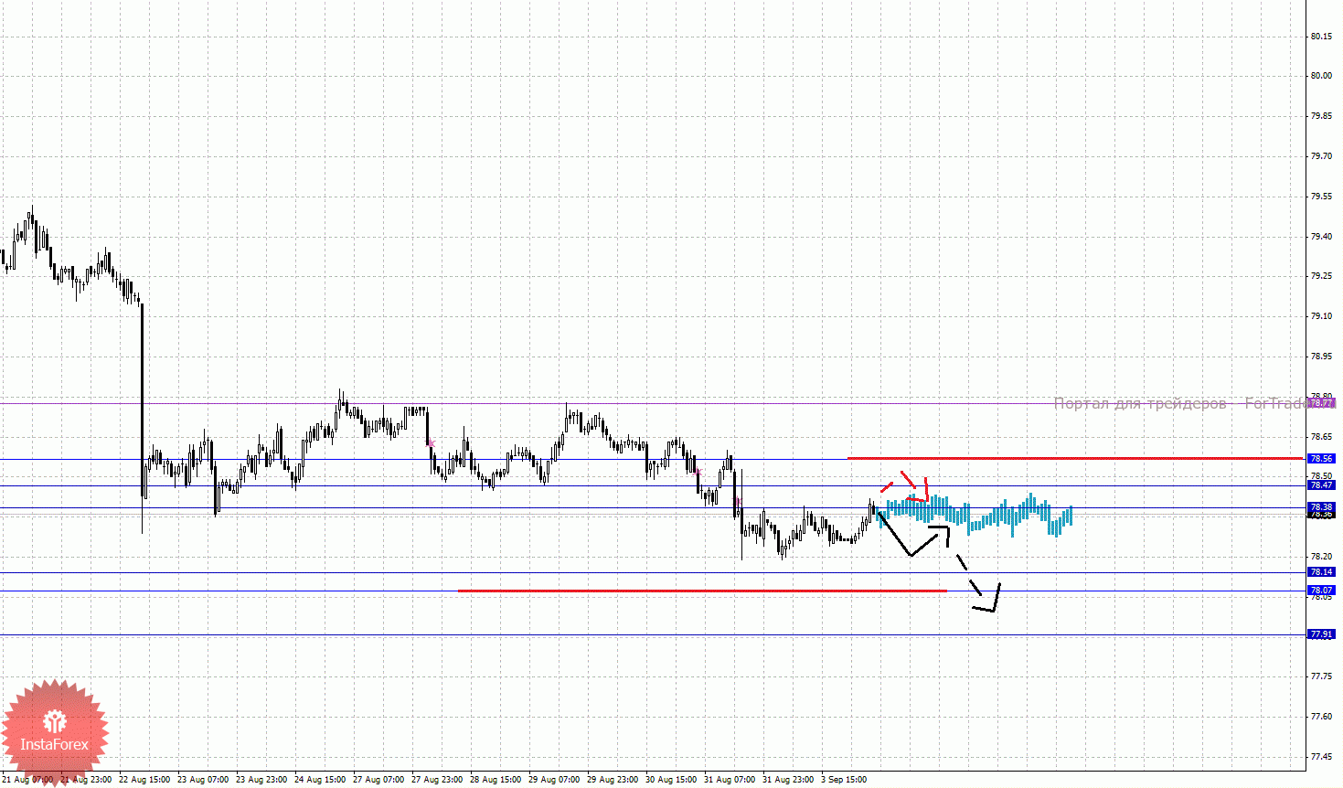 По паре Доллар/Иена ключевыми уровнями являются: 78.77, 78.56, 78.47, 78.38, 78.14, 78.07 и 77.91. Здесь потенциальной целью для нисходящего движения на текущий момент является уровень 78.14, по достижении которого ожидаем консолидированное движение в коридоре 78.14 – 78.07. Пробой уровня 78.07 позволит рассчитывать на движение к 77.91, возле этого уровня ожидаем консолидацию. Корректировочное восходящее движение возможно в коридоре 78.38 – 78.47, пробой последнего значения приведет к углубленному движению, здесь цель 78.56, от этого уровня высока вероятность разворота книзу, его пробой будет располагать к развитию восходящей структуры, в данном случае потенциальная цель – 78.77.