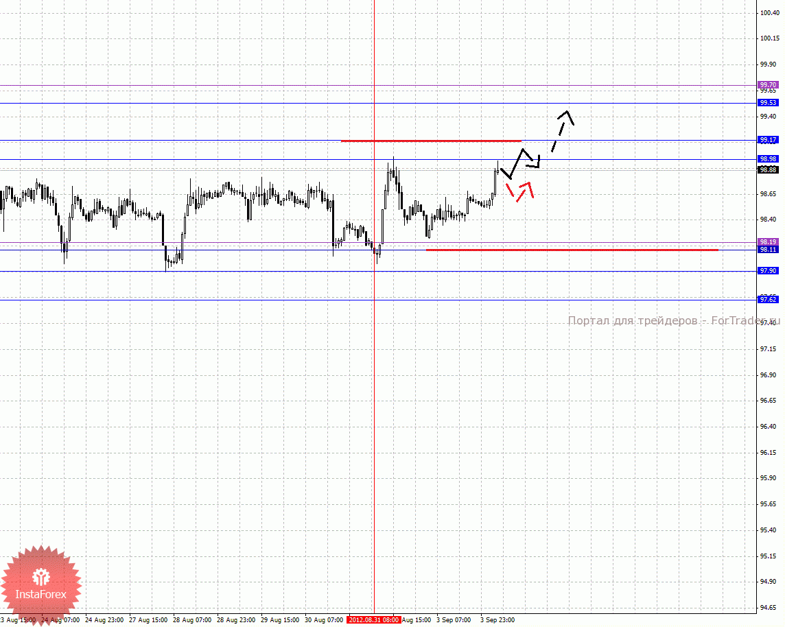 По паре Евро/Иена ключевыми уровнями являются: 99.70, 99.53, 99.17, 98.98, 98.19, 98.11, 97.90 и 97.62. Здесь от 31 августа формируется потенциал для развития восходящего движения, его отмены ожидаем после прохода ценой шумового диапазона 98.19 – 98.11, в данном случае первая цель 97.90. Потенциальным значением для нисходящего движения считаем уровень 97.62, по достижении которого ожидаем консолидацию. Продолжения развития восходящей структуры от 31 августа ожидаем после пробоя 98.98, в данном случае цель 99.17, в коридоре 98.98 – 99.17 консолидация цены. Пробой уровня 99.17 должен сопровождаться выраженным восходящим движением, в данном случае цель 99.53. Потенциальным значением для верха считаем уровень 99.70, по достижении которого ожидаем консолидированное движение.