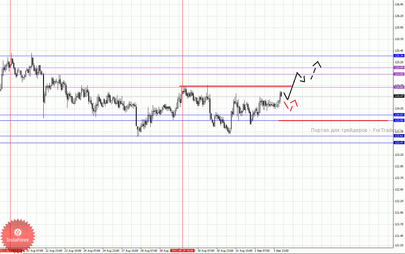 По паре Фунт/Иена ключевыми уровнями являются: 125.34, 125.09, 124.95, 124.66, 124.07, 123.95, 123.61 и 123.47. Здесь продолжения развития восходящей структуры ожидаем после пробоя 124.66, в данном случае цель 124.95, в коридоре 124.95 -125.09 консолидация цены. Потенциальным значением для верха считаем уровень 125.34, по достижении которого ожидаем откат книзу. Диапазон 124.07 – 123.95 является ключевой поддержкой для развития восходящей структуры, проход его ценой позволит рассчитывать на развитие нисходящей тенденции, в данном случае первая потенциальная цель 123.61. Диапазон 123.61 – 123.47 шумовой.