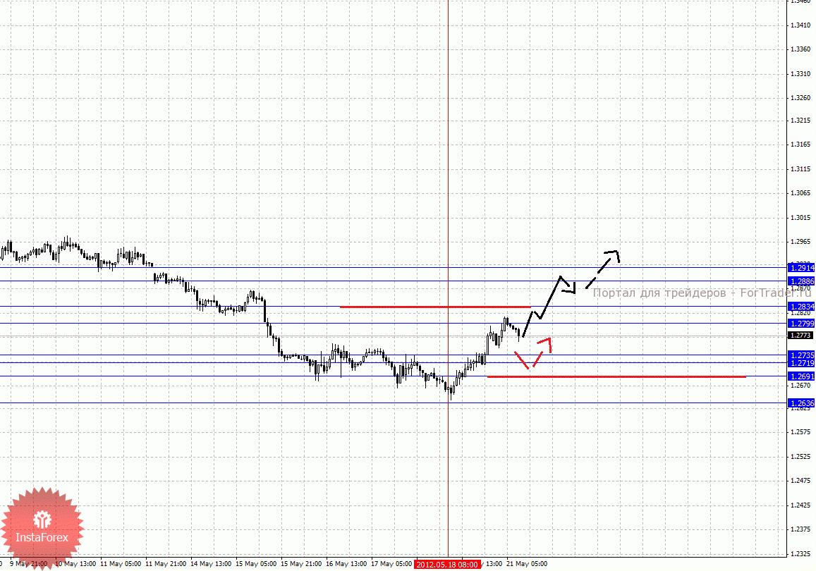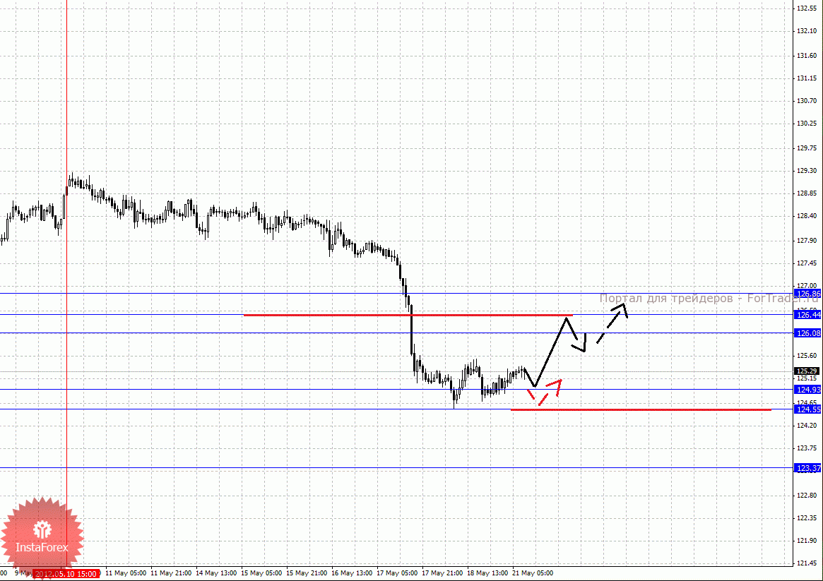 По паре Евро/Доллар важными уровнями являются: 1.2914, 1.2886, 1.2834, 1.2799, 1.2735, 1.2719, 1.2691 и 1.2636. Здесь восходящую структуру от 18 мая мы рассматриваем в качестве потенциальных начальных условий для восходящего цикла. Краткосрочное движение кверху ожидаем в коридоре 1.2799 – 1.2834, пробой последнего значения приведет к развитию импульса, в данном случае цель 1.2886. Потенциальным значением для верха пока считаем уровень 1.2914, по достижении которого ожидаем консолидированное движение в коридоре 1.2886 – 1.2914. Корректировочное нисходящее движение возможно после пробоя 1.2735 – 1.2719, в данном случае цель 1.2691, пробой последнего значения приведет к отмене восходящей структуры от 18 мая, здесь потенциальная цель – 1.2636.