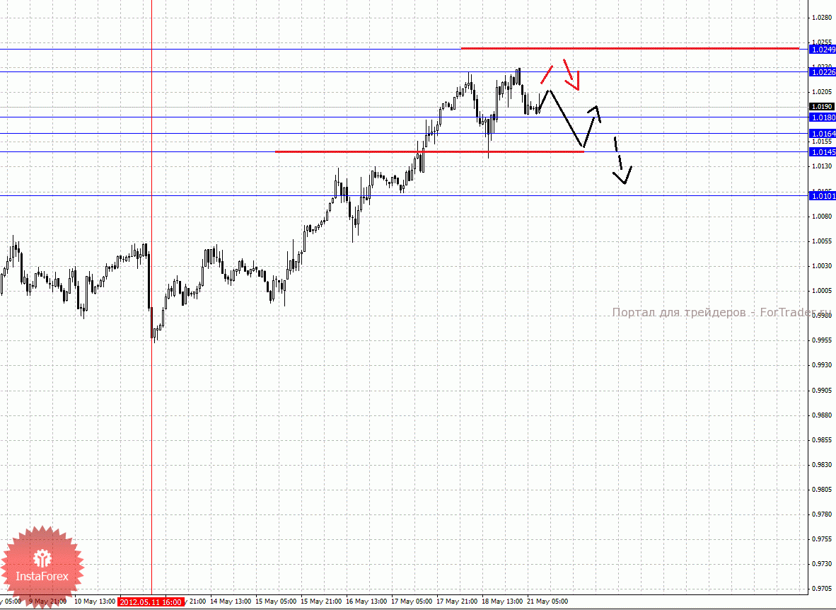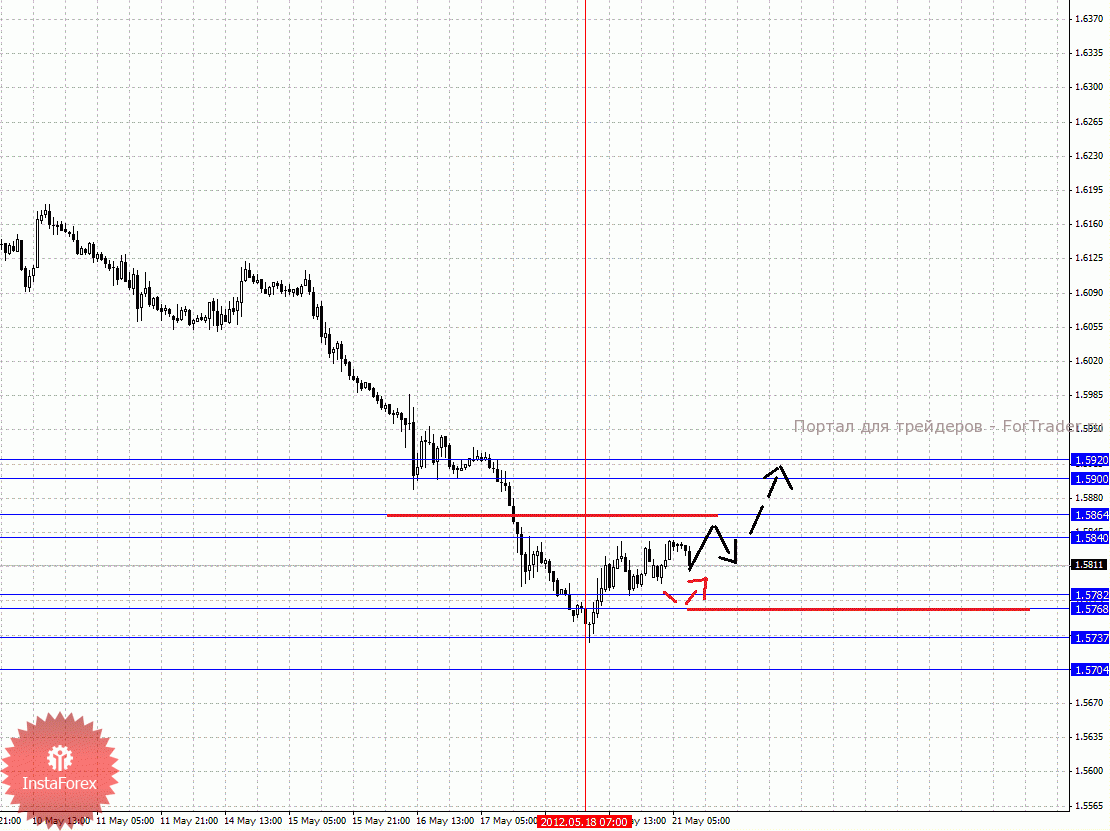 По паре Фунт/Доллар ключевыми уровнями являются: 1.5920, 1.5900, 1.5864, 1.5840, 1.5782, 1.5768, 1.5737 и 1.5704. Здесь, восходящую структуру от 18 мая мы рассматриваем в качестве потенциальных начальных условий для развития коррекции от нисходящей тенденции. Краткосрочное движение кверху ожидаем в коридоре 1.5840 – 1.5864, пробой последнего значения должен сопровождаться импульсивным движением, в данном случае цель 1.5900. Потенциальным значением для верха считаем уровень 1.5920, по достижении которого ожидаем консолидированное движение в коридоре 1.5900 – 1.5920. Корректировочное нисходящее движение возможно в коридоре 1.5782 – 1.5768, отсюда высока вероятность разворота кверху, пробой уровня 1.5768 приведет к отмене восходящей структуры, в данном случае первая цель – 1.5737. Потенциальным значением для низа считаем уровень 1.5704, по достижении которого ожидаем консолидацию.
