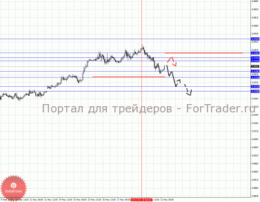 По паре Доллар/Франк ключевым уровня являются: 0.9524, 0.9463, 0.9442, 0.9430, 0.9385, 0.9358, 0.9318 и 0.9298. Здесь нисходящую структуру от 18 мая мы рассматриваем в качестве потенциальных начальных условий для нисходящего цикла. Краткосрочное нисходящее движение ожидаем в коридоре 0.9385 – 0.9358, пробой последнего значения должен сопровождаться импульсивным движением к уровню 0.9318. Потенциальным значением для низа пока считаем уровень 0.9298, по достижении которого ожидаем консолидированное движение в коридоре 0.9318 – 0.9298. Корректировочное нисходящее движение ожидаем в коридоре 0.9442 – 0.9463, отсюда высока вероятность разворота книзу, пробой уровня 0.9463 будет располагать к развитию восходящей тенденции, в данном случае потенциальная цель – 0.9524.