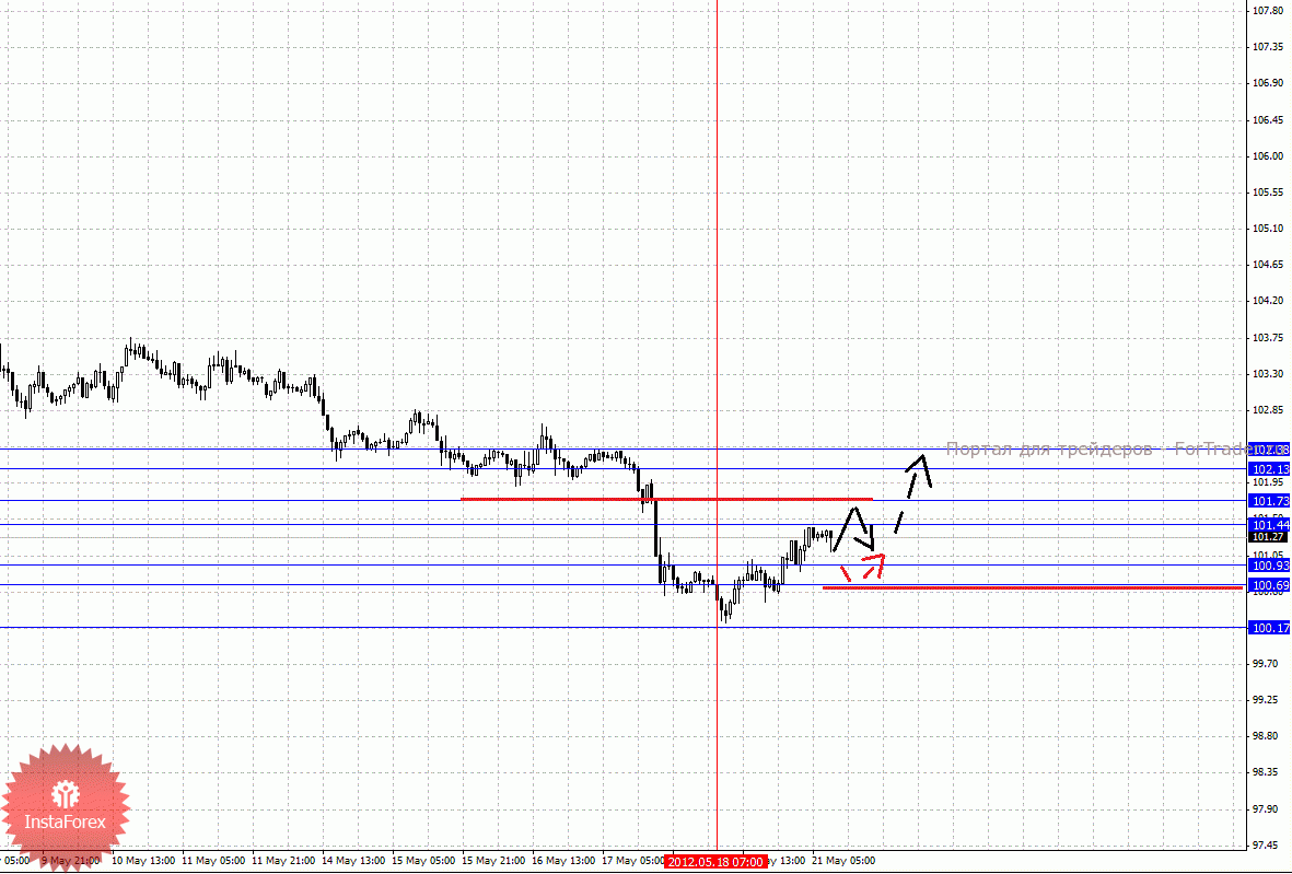 По паре Евро/Йена ключевыми уровнями являются: 102.38, 102.13, 101.73, 101.44, 100.93, 100.69 и 100.17. Здесь мы пока не наблюдаем выраженных начальных условий для развития восходящего цикла. Краткосрочное движение кверху ожидаем в коридоре 101.44 – 101.73, пробой последнего значения приведет к развитию выраженного движения, в данном случае цель – 102.13. Потенциальным значением для верха считаем уровень 102.38, по достижении которого ожидаем консолидацию в коридоре 102.13 – 102.38. Краткосрочное нисходящее движение возможно в коридоре 100.93 – 100.69, этот диапазон является ключевой поддержкой для верха, его проход ценой, приведет к отмене данной структуры и здесь первая цель 100.17.