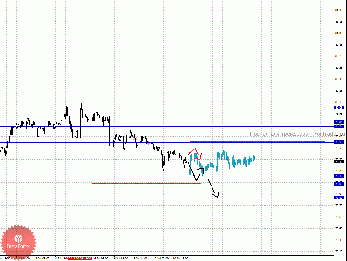 По паре Доллар/Иена ключевыми уровнями являются: 80.03, 79.84, 79.78, 79.58, 79.13, 79.03 и 78.85. Здесь краткосрочное нисходящее движение ожидаем в коридоре 79.13 – 79.03, пробой последнего значения приведет к движению до 78.85, по достижении данного уровня ожидаем откат кверху. Уровень 79.58 является ключевой поддержкой для нисходящей структуры от 5 июля, его пробой будет располагать к формированию восходящей структуры, в данном случае цель 79.78, диапазон 79.78 – 79.84 шумовой. В качестве потенциального значения для верха рассматриваем уровень 80.03, движение к которому ожидаем после пробоя 79.85.