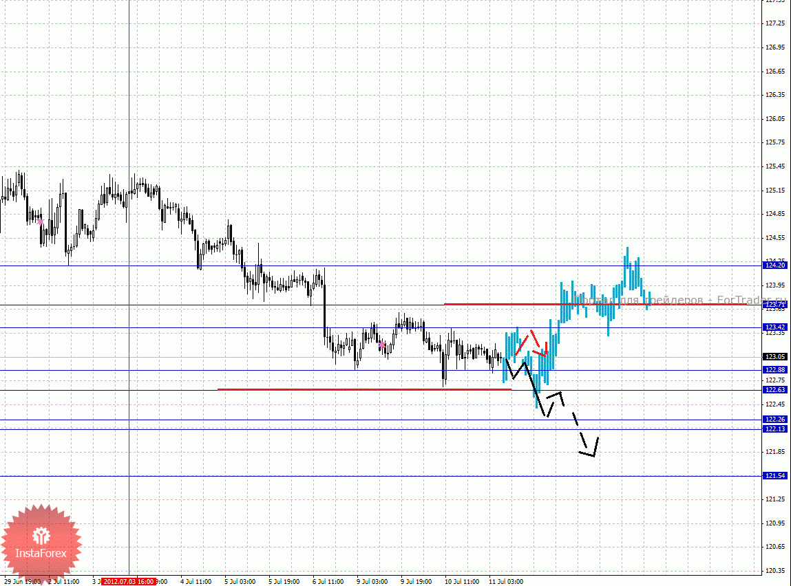 По паре Фунт/Иена ключевыми уровнями являются: 124.20, 123.71, 123.42, 122.88, 122.63, 122.26, 122.13 и 121.54. Здесь мы продолжаем следить за нисходящей структурой от 3 июля. Краткосрочное нисходящее движение ожидаем в коридоре 122.88 – 122.63, пробой последнего значения должен сопровождаться выраженным нисходящим движением, в данном случае цель 122.26, в коридоре 122.26 – 122.13 консолидация цены. Потенциальным значением для низа считаем уровень 121.54, движение к которому ожидаем после пробоя 122.10. Краткосрочное восходящее движение возможно в диапазоне 123.42 – 123.71, пробой последнего значения будет располагать к формированию восходящей структуры, здесь потенциальная цель – 124.20.