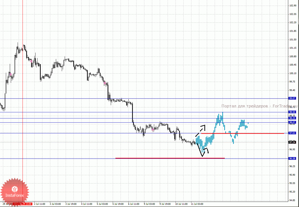 По паре Евро/Иена ключевыми уровнями являются: 99.07, 98.50, 98.25, 98.07, 97.63 и 96.58. Здесь потенциальным значением для нисходящей тенденции на текущий момент является уровень 96.58, по достижении которого ожидаем откат кверху. Краткосрочное восходящее движение возможно после пробоя 97.63, в данном случае цель 98.07. Проход ценой шумового диапазона 98.07 – 98.25 приведет к движению до 98.50, до этого уровня уже должны оформится начальные условия для последующего движения кверху.