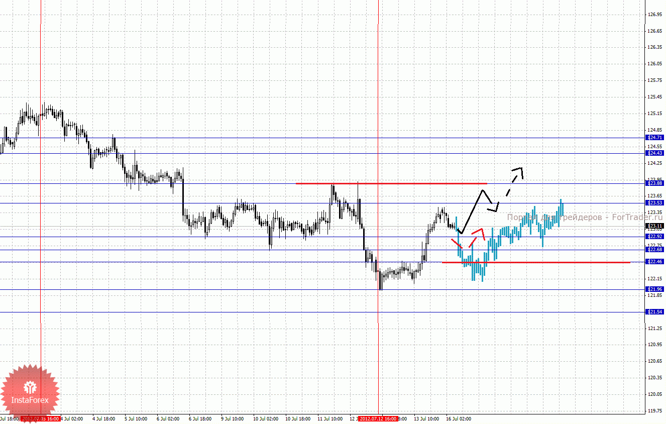 По паре Фунт/Иена ключевыми уровнями являются: 124.71, 124.43, 123.88, 123.53, 122.92, 122.68, 122.46, 121.96 и 121.54. Здесь восходящую структуру от 12 июля мы рассматриваем в качестве потенциальных начальных условий для развития восходящего цикла. Краткосрочное восходящее движение ожидаем в диапазоне 123.53 – 123.88, пробой последнего значения должен сопровождаться импульсивным движением, в данном случае цель – 124.43. Потенциальным значением для верха считаем уровень 124.71, по достижении которого ожидаем консолидацию. Краткосрочное нисходящее движение возможно в коридоре 122.92 – 122.68, пробой последнего значения приведет к углубленной коррекции, здесь цель 122.46, от этого уровня высока вероятность разворота кверху, его пробой приведет к отмене восходящей структуры от 12 июля и здесь первая цель 121.96.
