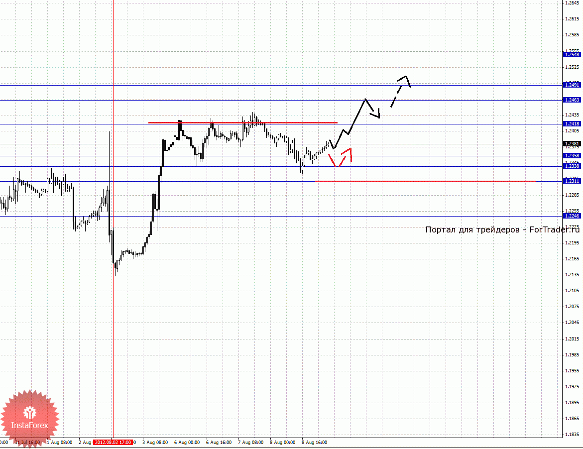 По паре Евро/Доллар важными уровнями являются: 1.2548, 1.2491, 1.2463, 1.2418, 1.2358, 1.2338, 1.2311 и 1.2246. Здесь ключевые цели остались без изменения и мы продолжаем следить за восходящей структурой от 2 августа. Продолжения восходящей тенденции ожидаем после пробоя 1.2418, в данном случае цель 1.2463, в коридоре 1.2463 – 1.2491 консолидация цены. Потенциальным значением для верха считаем уровень 1.2548, движение к которому ожидаем после пробоя 1.2491. Краткосрочное нисходящее движение возможно в коридоре 1.2358 – 1.2338, пробой последнего значения приведет к углубленной коррекции, здесь цель 1.2311, от этого уровня высока вероятность разворота кверху, его пробой будет располагать к развитию нисходящей структуры. Уровень 1.2246 пока интересен с точки зрения среднесрочной перспективы.