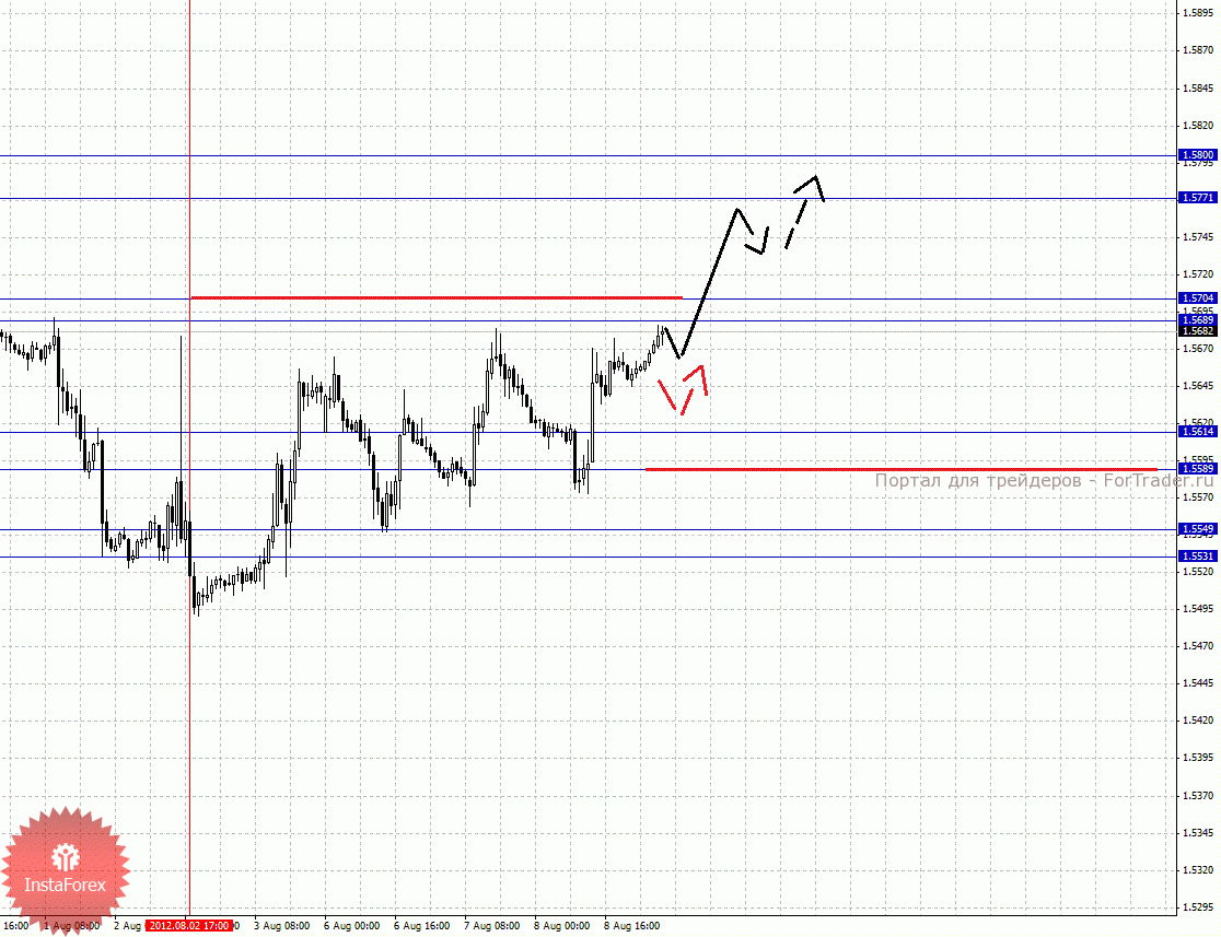 По паре Фунт/Доллар ключевыми уровнями являются: 1.5800, 1.5771, 1.5704, 1.5689, 1.5614, 1.5589, 1.5549 и 1.5531. Здесь продолжения движения кверху ожидаем после прохода ценой шумового диапазона 1.5689 – 1.5704, в данном случае цель 1.5771. Потенциальным значением для верха считаем уровень 1.5800, по достижении которого ожидаем консолидированное движение в коридоре 1.5771 – 1.5800. Краткосрочное нисходящее движение возможно в коридоре 1.5614 – 1.5589, пробой последнего значения окажет негативное влияние на развитие восходящей структуры от 2 августа, в данном случае мы ожидаем неустойчивое движение к уровню 1.5549. Диапазон 1.5549 – 1.5531 является ключевой поддержкой для восходящей тенденции, проход его ценой приведет к отмене данной структуры.