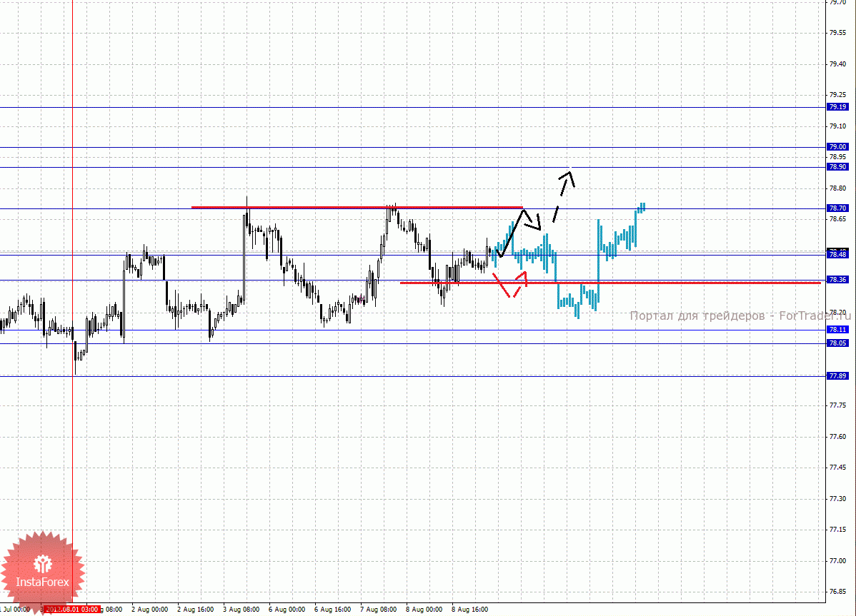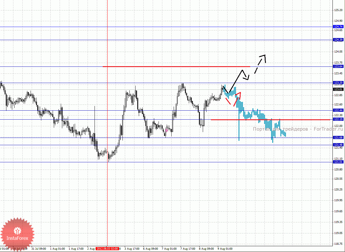 По паре Фунт/Иена ключевыми уровнями являются: 124.74, 124.39, 123.64, 123.20, 122.44, 122.19, 121.68, 121.48 и 121.01. Здесь мы продолжаем следить за восходящей структурой от 3 августа. Краткосрочное восходящее движение возможно в диапазоне 123.20 – 123.64, пробой последнего значения должен сопровождаться выраженным восходящим движением, в данном случае цель 124.39. Потенциальным значением для верха считаем уровень 124.74, по достижении которого ожидаем консолидированное движение в коридоре 124.39 – 124.74. Краткосрочное нисходящее движение возможно в коридоре 122.44 – 122.19, пробой последнего значения будет сопровождаться неустойчивым движением книзу, здесь цель – 121.68, от этого уровня мы ожидаем последний ключевой разворот кверху. Проход ценой шумового диапазона 121.68 – 121.48 приведет к отмене восходящей структуры в масштабе Н1, в данном случае первая потенциальная цель – 121.01.
