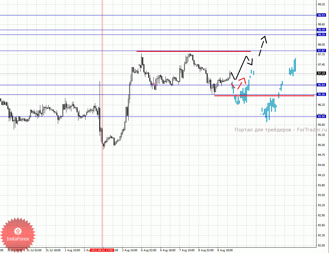 По паре Евро/Иена ключевыми уровнями являются: 98.93, 98.49, 98.35, 97.87, 97.33, 96.84, 96.56 и 95.90. Здесь продолжения развития восходящей структуры от 2 августа ожидаем после пробоя 97.87, в данном случае первая цель 98.35, в коридоре 98.35 – 98.49 консолидация цены. Потенциальным значением для верха считаем уровень 98.93, по достижении которого ожидаем откат книзу. Диапазон 96.84 – 96.56 является ключевой поддержкой, в нем мы ожидаем краткосрочное нисходящее движение, пробой уровня 95.56 окажет негативное влияние на развитие восходящей тенденции в масштабе Н1, в данном случае потенциальная цель 95.90, до этого уровня ожидаем оформления начальных условий для определения последующих целей.