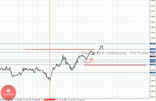 По паре Доллар/Канадский доллар ключевыми уровнями являются: 0.9984, 0.9963, 0.9952, 0.9923, 0.9916, 0.9906 и 0.9876. Здесь мы продолжаем следить за восходящей структурой от 21 августа. Краткосрочное движение кверху ожидаем в коридоре 0.9952 – 0.9963, пробой последнего значения позволит рассчитывать на движение к потенциальной цели – 0.9984, по достижении этого уровня ожидаем консолидацию. Корректировочное нисходящее движение возможно в коридоре 0.9923 – 0.9916, пробой последнего значения приведет к углубленному движению, здесь цель – 0.9906, от этого уровня высока вероятность разворота кверху, его пробой будет располагать к развитию нисходящей структуры, в данном случае потенциальная цель – 0.9876.Торговые рекомендации:Buy: 0.9952 Take profit: 0.9960