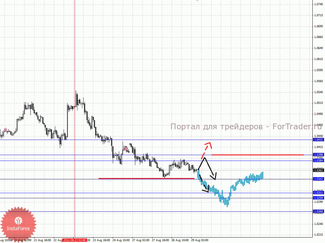По паре Австралийский доллар/Доллар ключевыми уровнями являются: 1.0431, 1.0398, 1.0384, 1.0342, 1.0311, 1.0299 и 1.0268. Здесь основные цели остались без изменения и мы продолжаем следить за развитием нисходящей структуры от 23 августа. Продолжения движения книзу ожидаем после пробоя 1.0342, в данном случае цель 1.0311, в коридоре 1.0311 – 1.0299 консолидация цены. Потенциальным значением для низа считаем уровень 1.0268, по достижении которого ожидаем откат кверху. Краткосрочное восходящее движение ожидаем в коридоре 1.0384 – 1.0398, пробой последнего значения будет располагать к развитию восходящей структуры, в данном случае потенциальная цель – 1.0431.