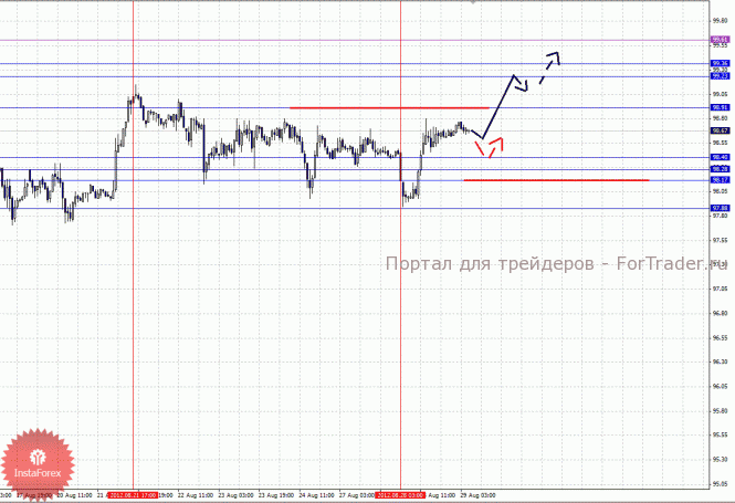 По паре Евро/Иена ключевыми уровнями являются: 99.61, 99.36, 99.23, 98.91, 98.40, 98.28, 98.17 и 97.88. Здесь от 28 августа формируется локальная структура для продолжения развития восходящего движения. Продолжения движения кверху ожидаем после пробоя 98.91, в данном случае цель 99.23, в коридоре 99.23 – 99.36 консолидация цены. Потенциальным значением для верха считаем уровень 99.61, по достижении которого ожидаем откат книзу. Корректировочное нисходящее движение возможно в коридоре 98.40 – 98.28, пробой последнего значения приведет к углубленному движению, в данном случае цель 98.17, пробой которого в свою очередь отменит развитие восходящей структуры от 28 августа, здесь потенциальная цель – 97.88.