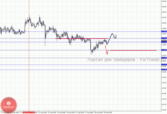 По паре Фунт/Иена ключевыми уровнями являются: 124.66, 124.35, 124.16, 123.80, 123.44, 123.13 и 122.90. Здесь консолидированное движение ожидаем в диапазоне 124.16 – 124.35, пробой последнего значения окажет негативное влияние на развитие нисходящей структуры от 21 августа, в данном случае потенциальная цель – 124.66. Продолжения движения книзу ожидаем после пробоя 123.80, здесь первая цель 123.44, далее уровни остались без изменений.
