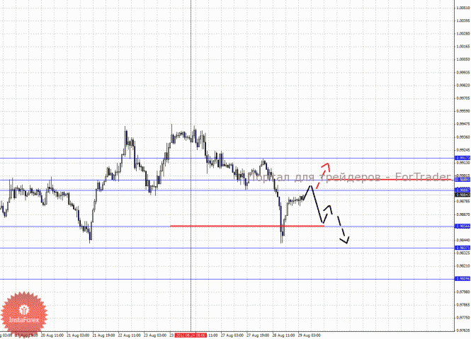 По паре Доллар/Канадский доллар ключевыми уровнями являются: 0.9917, 0.9898, 0.9888, 0.9856, 0.9837 и 0.9809. Здесь краткосрочное восходящее движение возможно в диапазоне 0.9887 – 0.9898, пробой последнего значения будет располагать к формированию потенциальных начальных условий для развития восходящего цикла, в данном случае цель 0.9917. Продолжения развития нисходящей структуры от 24 августа ожидаем после пробоя 0.9856, в данном случае первая цель 0.9837, возле этого уровня консолидация. Потенциальным значением для низа считаем уровень 0.9809, движение к которому ожидаем после пробоя 0.9835.