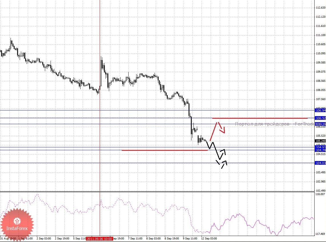 По паре Евро/Йена ключевыми уровнями являются: 106.94, 106.52, 106.19, 104.91, 104.74 и 104.03. Здесь мы продолжаем следить за нисходящей структурой от 6 сентября. Продолжения движения к низу, ожидаем после прохода ценой шумового диапазона 104.91 – 104.74, в данном случае потенциальная цель 104.03, по достижении этого уровня откат к верху. Корректировочное восходящее движение, возможно в диапазоне 106.19 – 106.52, пробой последнего значения приведет к углубленному движению, здесь цель 106.94, до этого уровня мы ожидаем формирования небольших начальных условий для восходящего цикла.