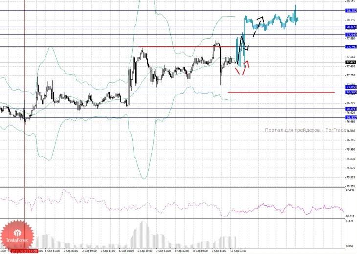 По паре Доллар/Йена ключевыми уровнями являются: 78.35, 78.07, 77.94, 77.74, 77.05, 76.96, 76.69 и 76.53. Здесь ключевые цели остались без изменения. Продолжения восходящего цикла от 31 августа, ожидаем после пробоя 77.74, в данном случае цель 77.94, в коридоре 77.94 – 78.07 консолидация цены. Потенциальным значением для верха, считаем уровень 78.35, по достижении которого, ожидаем откат к низу. Диапазон 77.05 – 76.96 является ключевой поддержкой для верха, его проход ценой будет располагать к развитию нисходящей структуры, здесь потенциальная цель 76.69. Диапазон 76.69 – 76.53 шумовой, до него мы ожидаем формирования начальных условий для развития нисходящей тенденции.