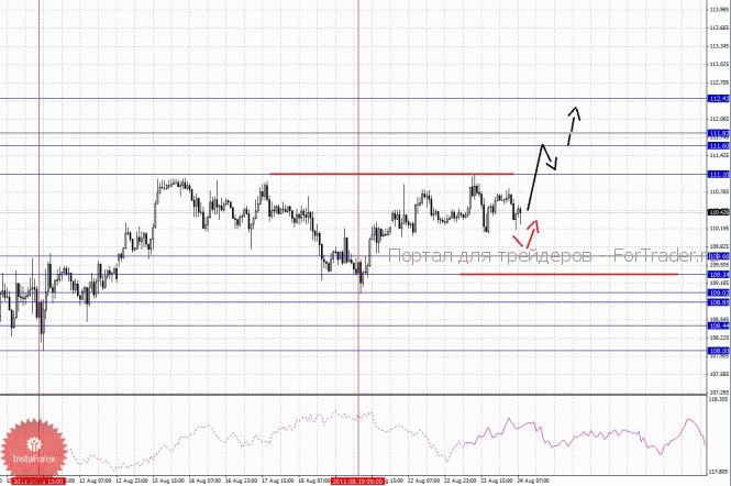 По паре Евро/Йена ключевыми уровнями являются: 112.43, 111.82, 111.60, 111.10, 109.66, 109.34. 109.02, 108.85, 108.44 и 108.00. Здесь, цена оформила локальные начальные условия от 19 августа для развития восходящей структуры. Продолжения движения к верху, ожидаем после пробоя 111.10, в данном случае цель 111.60, в коридоре 111.60 – 111.82 консолидация цены. Пробой уровня 111.82 позволит рассчитывать на движение к потенциальной цели – 112.43, по достижении которого, ожидаем консолидацию. Уровень 109.66 является ключевой поддержкой для верха, его пробой приведет к краткосрочному нисходящему движению в диапазоне 109.66 – 109.34. Пробой 109.34 отменит развитие восходящей структуры и здесь первая цель 109.02. Далее ключевые уровни для нисходящего движения остались без изменения.