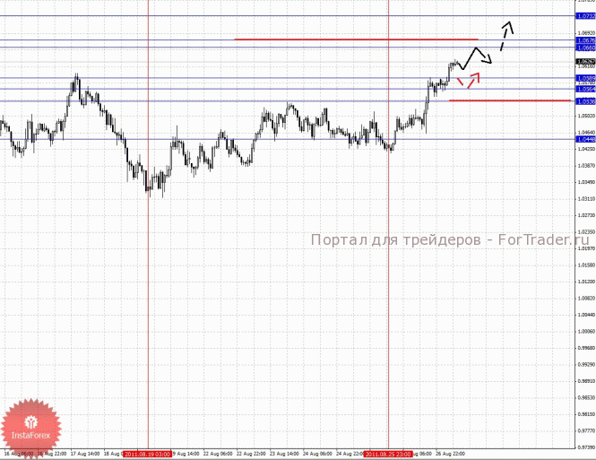 Уважаемые трейдеры в своем аналитическом обзоре я рассматриваю развитие структуры на предстоящий день по таким валютным парам как: EUR/USD, GBP/USD, USD/CHF, USD/JPY, AUD/USD, USD/CAD, EUR/JPY, GBP/JPY и EUR/USD. После прочтения данного материала, Вы должны наиболее четко и понятно представлять возможные перспективы развития валют. В данном методе анализа, для наиболее простого изложения своего подхода к рынку, я использую стандартные термины технического анализа, такие как: уровни поддержки и сопротивления, однако сам метод основан на свойствах фрактальной функции и несет в себе глубокий смысл понимания развития текущей, и будущей ситуации. Все свои расчеты я выполняю от начальных условий развития цикла. Черной стрелкой указано направление движение цены от текущих начальных условий. Красной стрелкой показано альтернативное движение, в случае пробоя ключевых уровней для отмены развития восходящего/нисходящего цикла. Пунктирными стрелками я указываю продолжение движения. Как правило, красной стрелкой я указываю корректировочное движение и краткосрочный выход за уровень. Убедительная просьба: не используйте только одни изображения, изучите текст, чтобы понять последовательность развития того или иного события. Также, прошу учесть, что для более ясного понимания изложенного здесь материала, необходимо ознакомиться с фрактальным анализом, так Вы сможете понимать то, что здесь написано, и как это можно использовать в своей торговой системе.