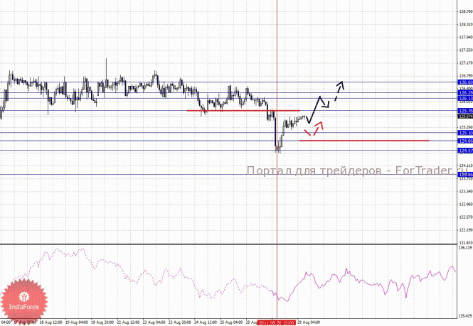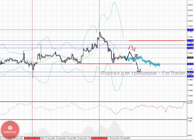По паре Евро/Доллар мы следим за развитием восходящей структуры от 19 августа. По паре Доллар/Франк также продолжаем следить за восходящей тенденцией в масштабе Н1. По паре Фунт/Доллар от 26 августа формируется потенциал для верха. По паре Доллар/Йена уровень 76.45 является ключевой поддержкой для верха, пробой данного значения приведет к развитию нисходящей структуры от 25 августа. По паре Евро/Йена ключевые цели остались без изменения и мы продолжаем следить за развитием восходящей тенденции. По паре Фунт/Йена от 26 августа формируется потенциал для верха.