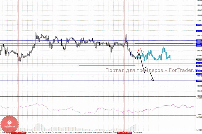 По паре Доллар/Канадский доллар ключевыми уровнями являются: 0.9976, 0.9941, 0.9890, 0.9873, 0.9862, 0.9765, 0.9751, 0.9721, 0.9705 и 0.9668. Здесь от 26 августа формируется потенциал для нисходящего движения. Продолжения движения к низу, ожидаем после прохода ценой шумового диапазона 0.9765 – 0.9751, в данном случае цель 0.9721, в коридоре 0.9721 – 0.9705 консолидация цены. Потенциальным значением для низа, считаем уровень 0.9668, по достижении которого, ожидаем откат к верху. Краткосрочное восходящее движение, ожидаем в диапазоне 0.9873 – 0.9890. Уровень 0.9890 является ключевым сопротивлением для верха, его пробой должен сопровождаться выраженным восходящим движением, здесь цель 0.9941. Потенциальным значением для верха, считаем уровень 0.9976, по достижении которого, ожидаем консолидацию.