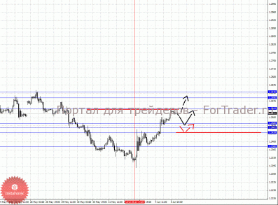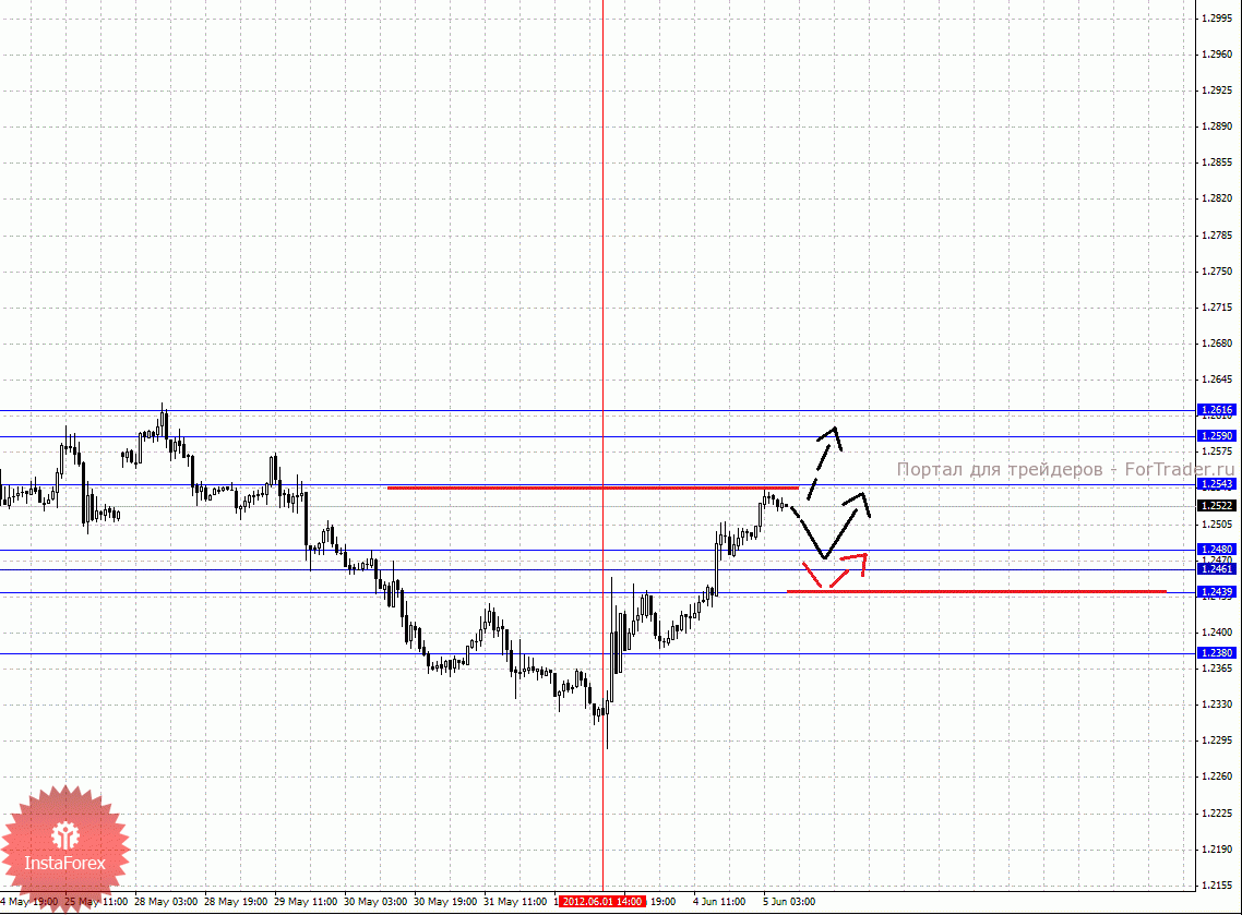 По паре Евро/Доллар важными уровнями являются: 1.2616, 1.2590, 1.2543, 1.2480, 1.2461, 1.2439 и 1.2380. Здесь мы следим за восходящей структурой от 1 июня. Продолжения движения кверху ожидаем после пробоя 1.2543, в данном случае цель 1.2590. Потенциальным значением для верха считаем уровень 1.2616, который формирует шумовой диапазон 1.2616 – 1.2590, до которого мы ожидаем оформления больших начальных условий для восходящего цикла. Корректировочное движение книзу ожидаем в коридоре 1.2480 – 1.2461, пробой последнего значения приведет к углубленному движению, здесь цель 1.2439, от этого уровня высока вероятность разворота кверху, его пробой будет располагать к развитию нисходящей структуры, в данном случае потенциальная цель 1.2380.