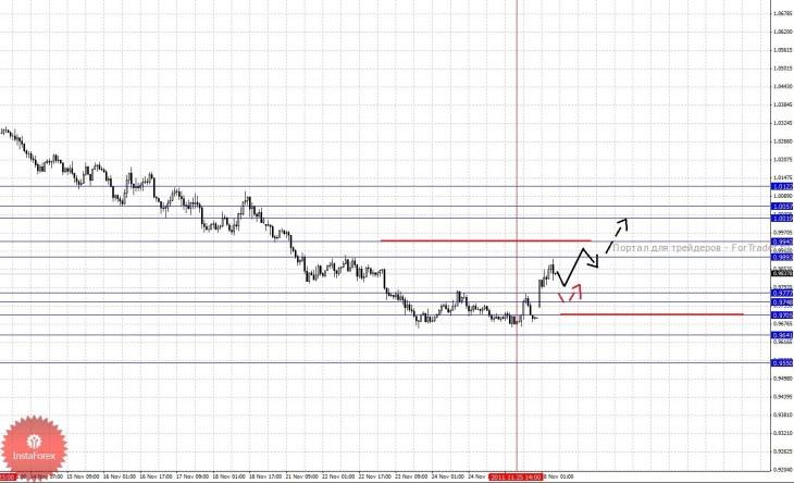 По паре Австралийский доллар/Доллар ключевыми уровнями являются: 1.0122, 1.0057, 1.0019, 0.9943, 0.9893, 0.9777, 0.9748, 0.9705, 0.9641 и 0.9550. Здесь от 25 ноября формируется потенциал для восходящего движения. Краткосрочное движение к верху ожидаем в диапазоне 0.9893 – 0.9943, пробой последнего значения приведет к развитию импульса, в данном случае цель 1.0019, в коридоре 1.0019 – 1.0057 консолидация цены. Потенциальным значением для верха считаем уровень 1.0122, по достижении которого ожидаем откат книзу. Краткосрочное нисходящее движение возможно в диапазоне 0.9777 – 0.9748, пробой последнего значения приведет к углубленному движению, здесь цель 0.9705, от этого уровня мы ожидаем разворот к верху, его пробой приведет к отмене восходящей структуры и в данном случае первая цель 0.9641. Потенциальным значением для нисходящей структуры от 11 ноября считаем уровень 0.9550.