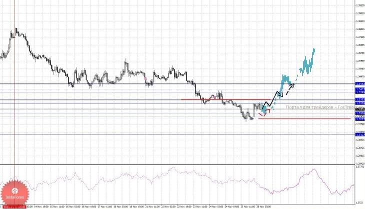 По паре Евро/Доллар важными уровнями являются: 1.3453, 1.3417, 1.3399, 1.3353, 1.3328, 1.3266, 1.3227 и 1.3127. Здесь краткосрочное восходящее движение ожидаем в диапазоне 1.3328 – 1.3353, пробой последнего значения должен сопровождаться выраженным восходящим движением к уровню 1.3399, в коридоре 1.3399 – 1.3417 консолидация цены. Потенциальным значением для верха считаем уровень 1.3453, до этого уровня ожидаем оформления больших начальных условий. Краткосрочное нисходящее движение возможно в диапазоне 1.3266 – 1.3227, пробой последнего значения продолжит развитие нисходящей структуры от 11 ноября, в данном случае потенциальная цель 1.3127.