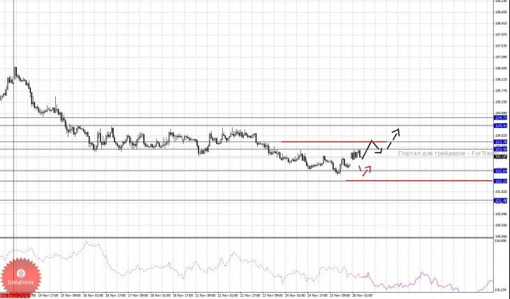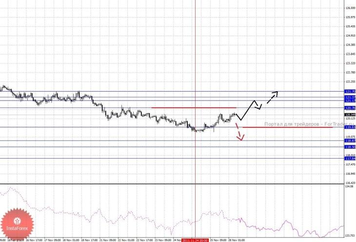 По паре Фунт/Йена ключевыми уровнями являются: 121.70, 121.37, 121.17, 120.76, 119.65, 118.87, 118.50 и 117.84. Здесь от 24 ноября наблюдается потенциал для верха. Продолжения развития восходящей структуры ожидаем после пробоя 120.76, в данном случае цель 121.17, в коридоре 121.17 – 121.37 консолидация цены. Потенциальным значением для верха считаем уровень 121.70, по достижении которого ожидаем откат к низу. Уровень 119.65 является ключевой поддержкой для верха, его пробой позволит рассчитывать на движение к 118.87, в коридоре 118.87 – 118.50 консолидация цены. Потенциальным значением для низа считаем уровень 117.84, по достижении которого ожидаем откат к верху.