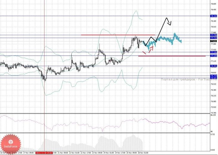 По паре Доллар/Йена ключевыми уровнями являются: 78.29, 77.79, 77.72, 77.34, 77.25, 76.99, 76.73 и 76.68. Здесь мы продолжаем рассматривать восходящую структуру от 18 ноября. Продолжения движения к верху, в качестве импульса, ожидаем после прохода ценой шумового диапазона 77.72 – 77.79, в данном случае потенциальная цель 78.29, возле этого уровня консолидация. Диапазон 77.34 – 77.25 является ключевой поддержкой для верха, в нем мы ожидаем краткосрочное нисходящее движение, пробой последнего значения будет располагать к развитию нисходящей структуры, в данном случае потенциальная цель – 76.99, до этого уровня мы ожидаем оформления начальных условий.