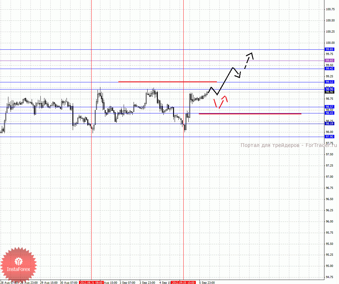 По паре Евро/Иена ключевыми уровнями являются: 99.85, 99.60, 99.42, 99.12, 98.96, 98.57, 98.43, 98.19 и 97.90. Здесь цена отменила восходящую структуру от 31 августа, однако на текущий момент мы наблюдаем потенциальную структуру для возобновления восходящего движения от 5 сентября. Краткосрочное движение кверху ожидаем в коридоре 98.96 – 99.12, пробой последнего значения должен сопровождаться выраженным восходящим движением, в данном случае цель 99.42, в коридоре 99.42 – 99.60 консолидация цены. Потенциальным значением для верха считаем уровень 99.85, по достижении которого ожидаем откат книзу. Краткосрочное нисходящее движение возможно в коридоре 98.57 – 98.43, пробой последнего значения приведет к углубленному движению, здесь цель 98.19, пробой которого, в свою очередь, будет располагать к развитию нисходящей структуры, в данном случае первая цель – 97.90.