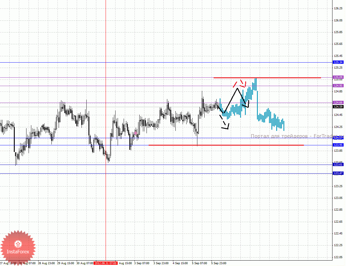 По паре Фунт/Иена ключевыми уровнями являются: 125.34, 125.09, 124.95, 124.66, 124.07, 123.95, 123.61 и 123.47. Здесь продолжения развития восходящей структуры ожидаем после пробоя 124.66, в данном случае цель 124.95, в коридоре 124.95 -125.09 консолидация цены. Потенциальным значением для верха считаем уровень 125.34, по достижении которого ожидаем откат книзу. Диапазон 124.07 – 123.95 является ключевой поддержкой для развития восходящей структуры, проход его ценой позволит рассчитывать на развитие нисходящей тенденции, в данном случае первая потенциальная цель 123.61. Диапазон 123.61 – 123.47 шумовой.