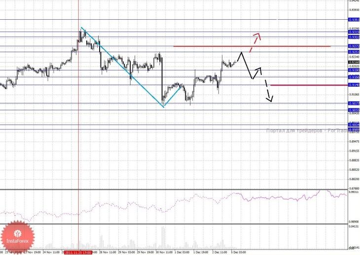 По паре Доллар/Франк ключевым уровня являются: 0.9361, 0.9319, 0.9302, 0.9272, 0.9251, 0.9190, 0.9166, 0.9140, 0.9077, 0.9055, 0.9004 и 0.8989. Здесь диапазон 0.9251 – 0.9272 является ключевой поддержкой для нисходящей структуры от 25 ноября, его пробой будет располагать к развитию восходящей тенденции, в данном случае цель – 0.9302, в коридоре 0.9302 – 0.9319 консолидация цены. Потенциальным значением для верха считаем уровень 0.9361, по достижении которого ожидаем откат книзу. Краткосрочное нисходящее движение возможно в диапазоне 0.9190 – 0.9166, пробой последнего значения приведет к углубленной коррекции, здесь цель 0.9140, от этого уровня есть вероятность разворота кверху, его пробой продолжит развитие нисходящей структуры от 25 ноября, в данном случае первая цель 0.9077. Структуру от 25 ноября мы рассматриваем в качестве среднесрочных начальных условий, а это значит, что опорные точки для шкалы Фибоначчи изменились.