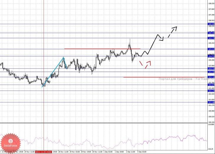 По паре Евро/Йена ключевыми уровнями являются: 106.68, 106.08, 105.74, 105.02, 104.53, 103.72, 103.49, 103.16, 102.64, 102.25 и 101.48. Здесь ключевые цели остались без изменения, и мы продолжаем рассматривать восходящую структуру от 25 ноября в качестве потенциальных начальных условий для восходящего цикла. Краткосрочное восходящее движение ожидаем в диапазоне 104.53 – 105.02, пробой последнего значения должен сопровождаться импульсивным движением к уровню 105.74, в коридоре 105.74 – 106.08 консолидация цены. Потенциальным значением для верха считаем уровень 106.68, по достижении которого ожидаем откат книзу. Корректировочное нисходящее движение возможно в коридоре 103.72 – 103.49, пробой последнего значения приведет к углубленному движению, здесь цель 103.16, этот уровень является ключевой поддержкой для верха, его пробой отменит развитие данной тенденции, здесь первая цель 102.64. Потенциальным значением для низа по-прежнему считаем уровень 101.48, движение к которому ожидаем после пробоя 102.25.