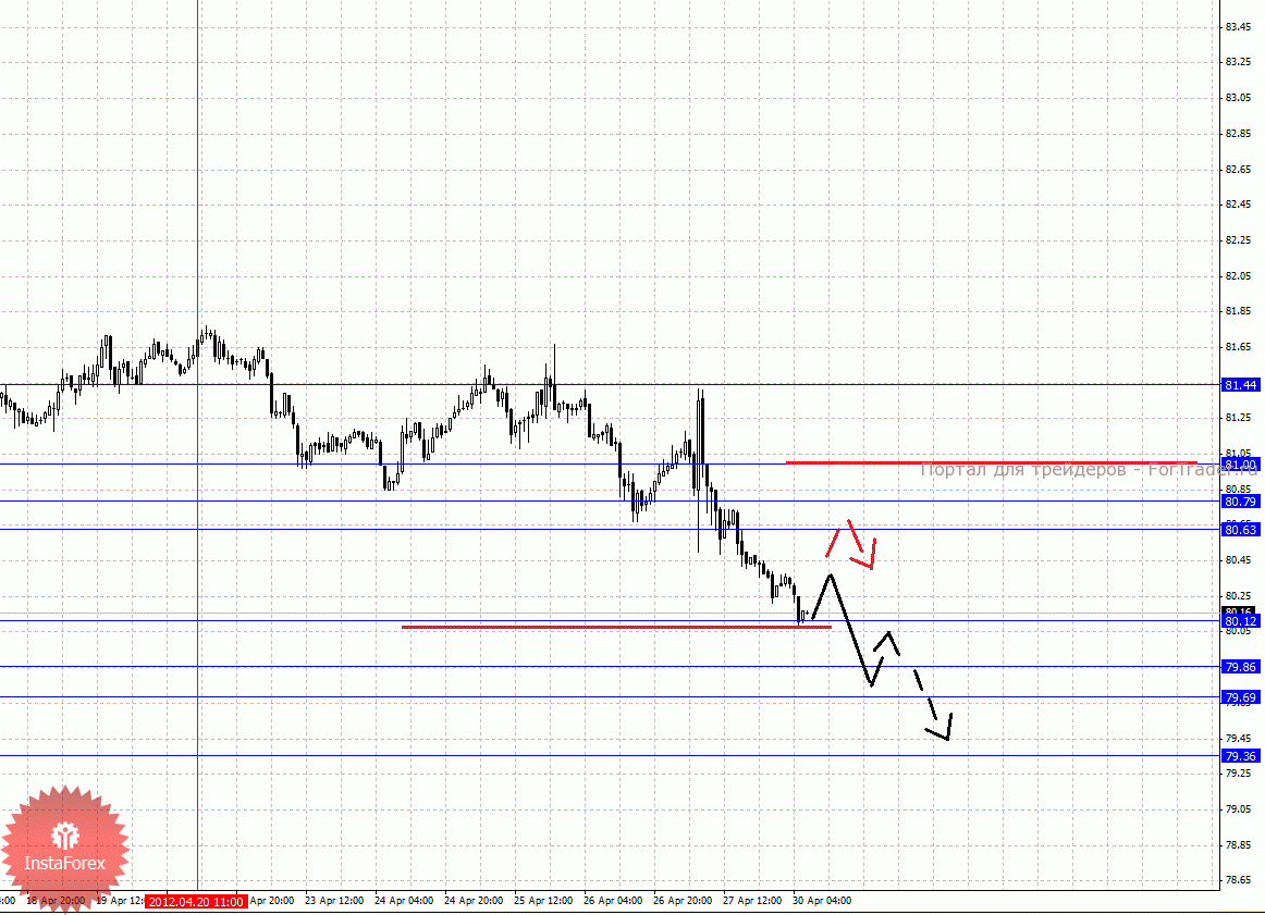 По паре Доллар/Йена ключевыми уровнями являются: 81.44, 81.00, 80.79, 80.63, 80.12, 79.86, 79.69 и 79.36. Здесь цена отменила развитие восходящей структуры от 16 апреля, и на текущий момент мы следим за развитием нисходящей структуры от 20 апреля. Продолжения движения книзу ожидаем после пробоя 80.12, в данном случае цель – 79.86, в коридоре 79.86 – 79.69 консолидация цены. Потенциальным значением для низа считаем уровень 79.36, по достижении которого ожидаем откат кверху. Корректировочное восходящее движение ожидаем в коридоре 80.63 – 80.79, пробой последнего значения приведет к углубленной коррекции, здесь цель 81.00. Уровень 81.00 является ключевой поддержкой для нисходящей тенденции, его пробой будет располагать к формированию восходящей структуры, здесь потенциальная цель – 81.44.