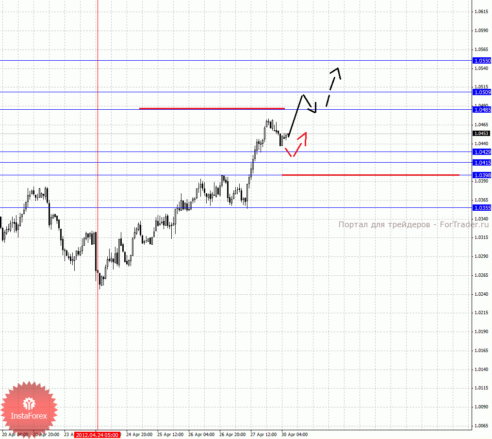 По паре Австралийский доллар/Доллар ключевыми уровнями являются: 1.0550, 1.0509, 1.0485, 1.0429, 1.0415, 1.0398 и 1.0355. Здесь мы продолжаем следить за развитием восходящей тенденции в масштабе Н1. Краткосрочное движение кверху ожидаем после пробоя 1.0485, в данном случае цель 1.0509, в этом коридоре консолидация цены. Пробой уровня 1.0509 должен сопровождаться выраженным восходящим движением к потенциальной цели – 1.0550, по достижении этого уровня ожидаем откат книзу. Корректировочное нисходящее движение возможно в коридоре 1.0429 – 1.0415, пробой последнего значения приведет к углубленной коррекции, здесь цель 1.0398, от этого уровня высока вероятность разворота кверху, его пробой окажет негативное влияние на формирование восходящей тенденции в масштабе Н1, в данном случае мы ожидаем неустойчивое движение книзу, потенциальная цель – 1.0355.