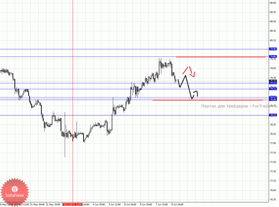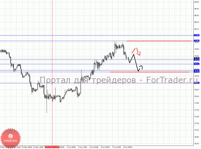 По паре Доллар/Йена ключевыми уровнями являются: 79.96, 79.80, 79.24, 79.11, 78.92, 78.88 и 78.55. Здесь краткосрочное нисходящее движение ожидаем в коридоре 79.24 – 79.11, пробой последнего значения приведет к развитию затяжной коррекции, в данном случае цель 78.92, возле этого уровня консолидация цены, также до него мы ожидаем оформления начальных условий для определения последующих целей. Уровень 78.55 интересен с точки зрения среднесрочной перспективы. Для продолжения развития восходящей структуры от 1 июня ожидаем оформления локальных начальных условий, что должно произойти до 79.80. Диапазон 79.80 – 79.96 шумовой.
