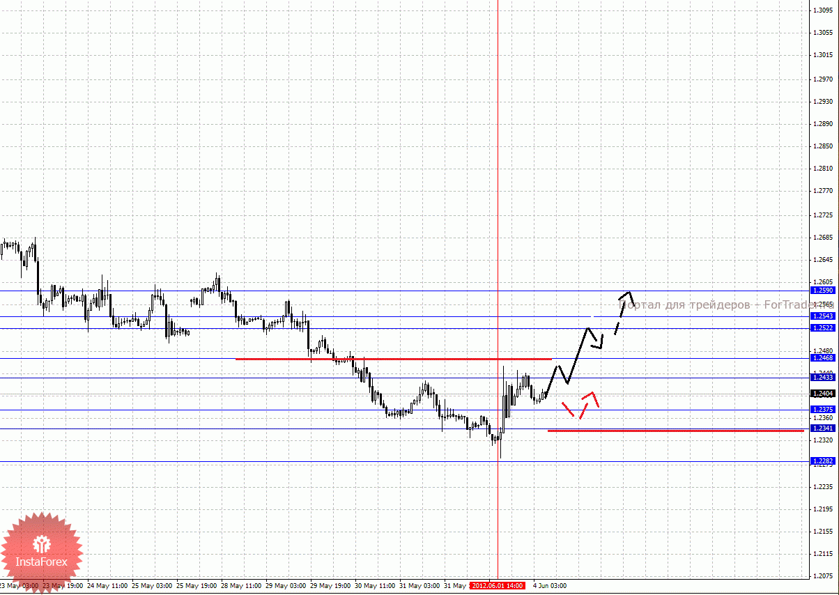 По паре Евро/Доллар важными уровнями являются: 1.2590, 1.2543, 1.2522, 1.2468, 1.2433, 1.2375, 1.2341 и 1.2282. Здесь от 1 июня формируется потенциал для развития восходящей коррекции. Краткосрочное восходящее движение ожидаем в коридоре 1.2433 – 1.2468, пробой последнего значения должен сопровождаться импульсивным движением к уровню 1.2522, в коридоре 1.2522 – 1.2543 консолидация цены. Потенциальным значением для верха считаем уровень 1.2590, по достижении которого ожидаем откат книзу. Краткосрочное нисходящее движение возможно в коридоре 1.2375 – 1.2341, пробой последнего значения будет располагать к продолжению нисходящей тенденции, в данном случае потенциальная цель 1.2282.