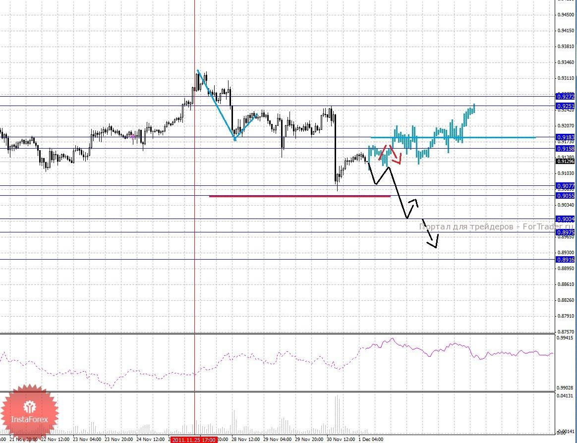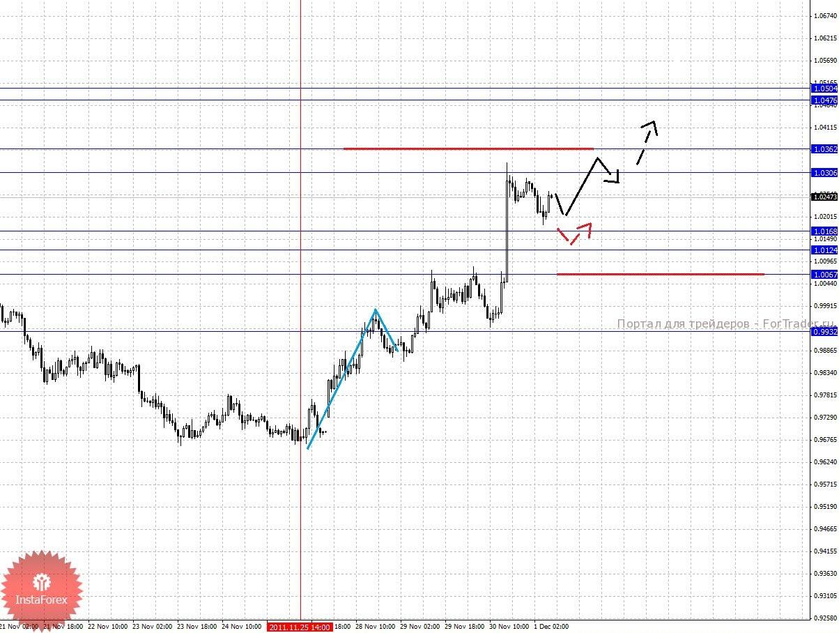 По паре Доллар/Канадский доллар ключевыми уровнями являются: 1.0361, 1.0281, 1.0242, 1.0216, 1.0132, 1.0070, 1.0033 и 0.9955. Здесь продолжения развития нисходящего цикла от 25 ноября ожидаем после пробоя 1.0132, в данном случае цель 1.0070, в коридоре 1.0070 – 1.0033 консолидация цены. Потенциальным значением для низа считаем уровень 0.9955, по достижении которого ожидаем откат кверху. Корректировочное восходящее движение возможно в коридоре 1.0216 – 1.0242, пробой последнего значения приведет к углубленному движению, здесь цель 1.0281, от этого уровня мы ожидаем разворот книзу, его пробой будет располагать к развитию восходящей структуры, в данном случае потенциальная цель 1.0361. До уровня 1.0361 мы ожидаем оформления начальных условий.