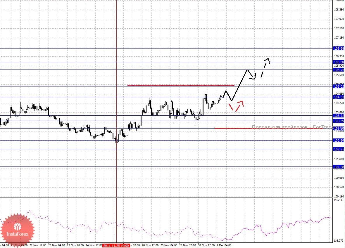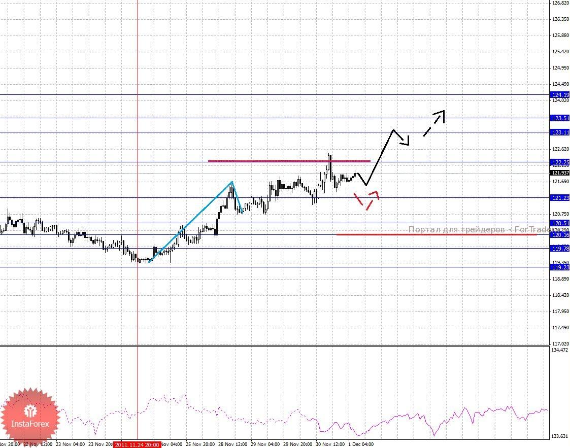 По паре Фунт/Йена ключевыми уровнями являются: 123.51, 123.11, 122.25, 121.70, 120.51, 120.16, 119.78 и 119.23. Здесь восходящую структуру от 24 ноября мы рассматриваем в качестве среднесрочных начальных условий. Продолжения движения кверху ожидаем после пробоя 122.25, в данном случае цель 123.11, по достижении которой ожидаем консолидированное движение в диапазоне 123.11 – 123.51. Потенциальным значением для верха считаем уровень 124.19, от которого ожидаем откат книзу. Краткосрочное движение книзу ожидаем после пробоя 121.23, здесь цели не определены. Корректировочное нисходящее движение возможно в диапазоне 120.51 – 120.16, пробой последнего значения приведет к углубленному движению, здесь цель 119.78, этот уровень является ключевой поддержкой для верха, его пробой отменит развитие данной структуры и здесь первая цель 119.23.