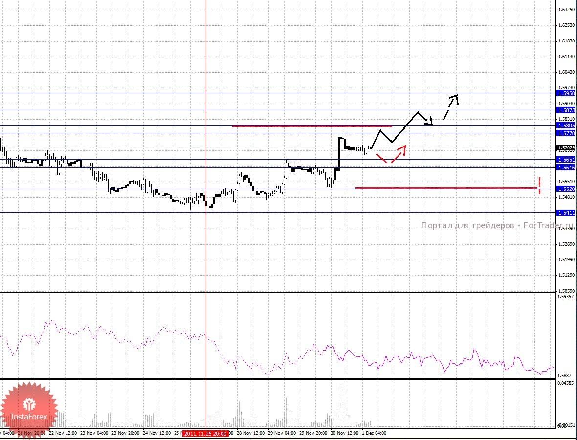 По паре Фунт/Доллар ключевыми уровнями являются: 1.5950, 1.5873, 1.5805, 1.5770, 1.5651, 1.5616, 1.5520 и 1.5411. Здесь продолжения движения кверху ожидаем после прохода ценой шумового диапазона 1.5770 – 1.5805, в данном случае цель 1.5873, возле этого уровня консолидация цены. Потенциальным значением для верха считаем уровень 1.5950, по достижении которого ожидаем откат книзу. Диапазон 1.5651 – 1.5616 является ключевой поддержкой для верха, его проход ценой окажет негативное влияние на развитие восходящей структуры от 25 ноября, в данном случае потенциальная цель 1.5520. Уровень 1.5520 является также ключевой поддержкой и его пробой приведет к отмене развития восходящей структуры, здесь первая цель 1.5411.