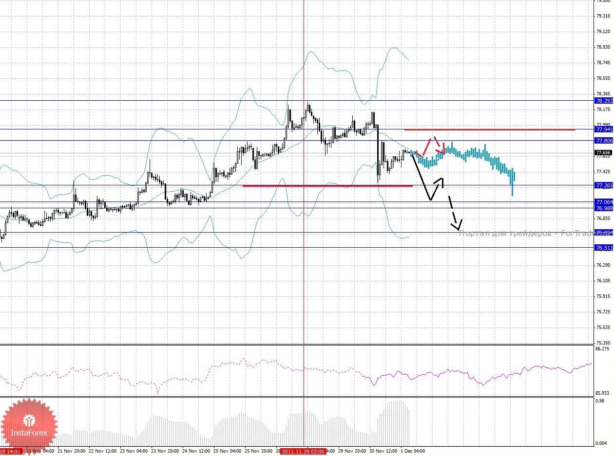 По паре Доллар/Йена ключевыми уровнями являются: 78.29, 77.94, 77.80, 77.26, 77.06, 76.98, 76.69 и 76.51. Здесь, учитывая размер масштабной сетки, мы рассматриваем нисходящую структуру от 29 ноября в качестве потенциальных начальных условий для развития нисходящего цикла. Продолжения движения книзу ожидаем после пробоя 77.26, в данном случае цель 77.06, возле этого уровня консолидация цены. Проход ценой шумового диапазона 77.06 – 76.98 должен сопровождаться импульсивным движением к уровню 76.69. Потенциальным значением для низа считаем уровень 76.51, по достижении которого ожидаем консолидацию в коридоре 76.69 – 76.51. Краткосрочное восходящее движение возможно в диапазоне 77.80 – 77.94, пробой последнего значения будет располагать к развитию восходящей структуры, здесь потенциальная цель 78.29, до этого уровня мы ожидаем оформления начальных условий для восходящего цикла.