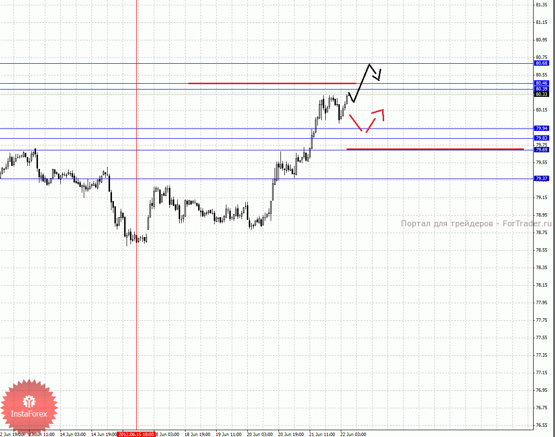 По паре Доллар/Йена ключевыми уровнями являются: 80.68, 80.46, 80.39, 79.94, 79.83, 79.69 и 79.37. Здесь мы следим за развитием восходящего цикла от 15 июня. Продолжения движения кверху ожидаем после прохода ценой шумового диапазона 80.39 – 80.46, в данном случае потенциальная цель 80.68, этот уровень является пределом, по его достижении ожидаем консолидацию, а также откат книзу. Краткосрочное нисходящее движение возможно в коридоре 79.94 – 79.83, пробой последнего значения приведет к углубленному движению, здесь цель 79.69, от этого уровня высока вероятность разворота кверху, его пробой будет располагать к формированию нисходящей структуры, в данном случае потенциальная цель 79.37.