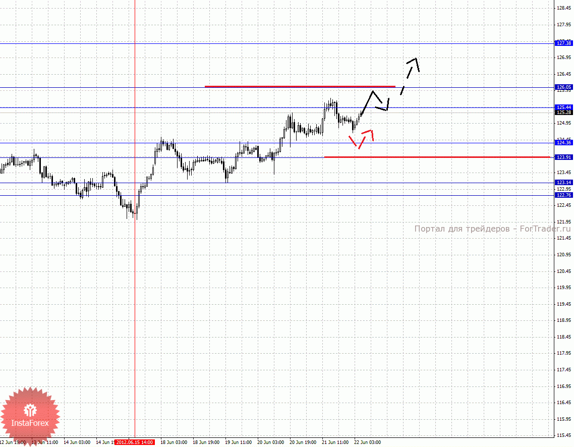 По паре Фунт/Йена ключевыми уровнями являются: 127.38, 126.05, 125.44, 124.36, 123.91, 123.14 и 122.76. Здесь продолжения движения кверху ожидаем после пробоя 125.44, в данном случае цель 126.05, в этом диапазоне консолидация цены. Пробой уровня 126.05 должен сопровождаться выраженным движением к уровню 127.38, по достижении которого ожидаем откат книзу. Краткосрочное нисходящее движение ожидаем в коридоре 124.36 – 123.91, отсюда высока вероятность разворота кверху, пробой уровня 123.91 окажет негативное влияние на развитие восходящей структуры от 15 июня, в данном случае потенциальная цель 123.14. Диапазон 123.14 – 122.76 шумовой, до него ожидаем оформления начальных условий для нисходящего цикла.