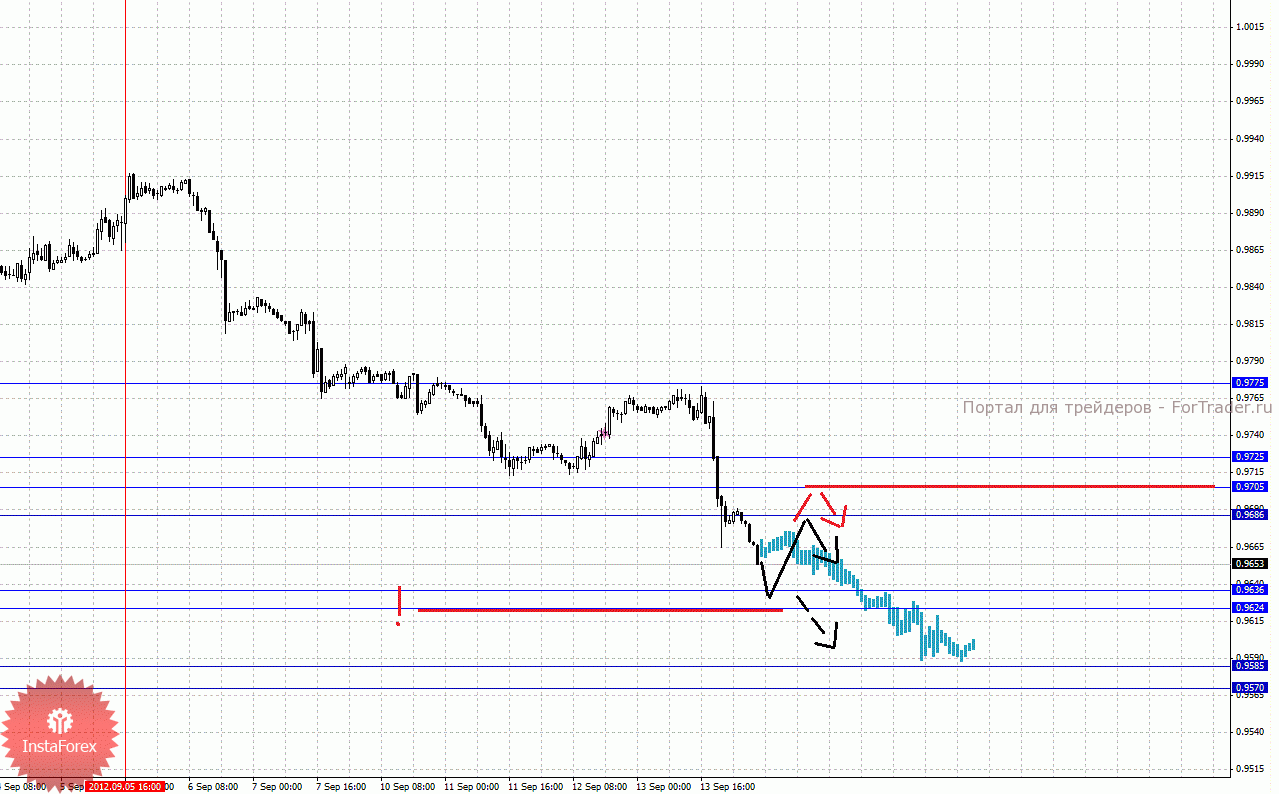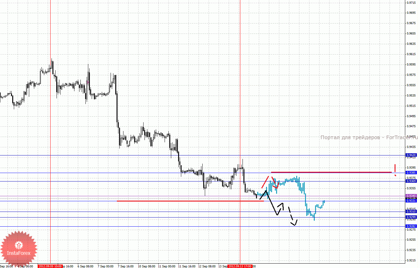 По паре Доллар/Франк ключевым уровня являются: 0.9420, 0.9385, 0.9369, 0.9340, 0.9331, 0.9310, 0.9299 и 0.9282. Здесь, нисходящую структуру от 13 сентября рассматриваем в качестве локальных начальных условий для продолжения основного движения. Продолжения движения книзу, ожидаем после выхода цены из шумового диапазона 0.9340 – 0.9331, в данном случае цель 0.9310, в коридоре 0.9310 – 0.9299 консолидация цены. Потенциальным значением для низа считаем уровень 0.9282, по достижении которого ожидаем откат кверху. Краткосрочное восходящее движение возможно в диапазоне 0.9369 – 0.9385, пробой последнего значения будет располагать к развитию восходящей структуры, в данном случае – 0.9420.