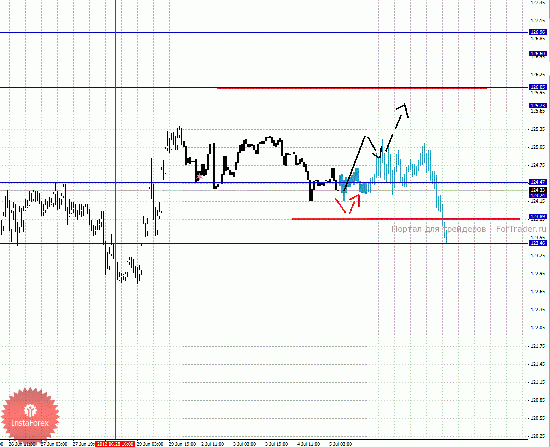 По паре Фунт/Иена ключевыми уровнями являются: 126.96, 126.60, 126.05, 125.73, 124.47, 124.24, 123.89 и 123.46. Здесь мы следим за развитием восходящей структуры от 28 июня. Краткосрочное восходящее движение ожидаем в коридоре 125.73 – 126.05, пробой последнего значения должен сопровождаться выраженным восходящим движением, в данном случае цель – 126.60. Потенциальным значением для верха считаем уровень 126.96, по достижении которого ожидаем консолидированное движение в коридоре 126.60 – 126.96. Краткосрочное нисходящее движение возможно в коридоре 124.47 – 124.24, пробой последнего значения приведет к углубленной коррекции, здесь цель 123.89, от этого уровня мы ожидаем разворот кверху, его пробой будет располагать к развитию нисходящей структуры, в данном случае первая цель 123.46.