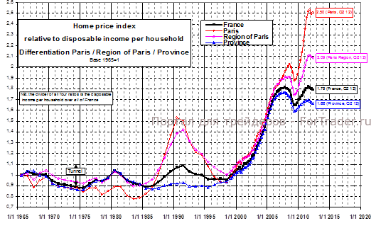 В довершение всех бед, на французском рынке недвижимости разросся грандиозный пузырь. Который как раз сейчас начинает схлопываться. Продажи недвижимости в Париже и в Иль-де-Франс по данным риэлтерского агентства MeilleursAgents этим летом составили всего 19% от объема за аналогичный период прошлого года. Ожидаемые цифры за осень еще хуже. «Испанская болезнь» переоцененной недвижимости докатилась потихонечку и до Франции. Индекс стоимости жилья относительно располагаемого дохода домохозяйств показывает огромную переоценку – нормированный и принятый за единицу показатель за 1965 год вырос к 2012-го до 2,5 в Париже и 1,79 для Франции.