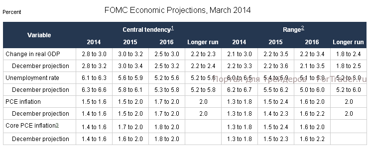 В своих экономических прогнозах на ближайшие годы ФРС несколько понизила темпы роста экономики, но улучшила прогнозы по безработице, в целом сохранив оценку инфляции. Темпы инфляции по-прежнему будут оставаться невысокими. 13 членов FOMC считают, что первое повышение процентной ставки произойдет уже в 2015 году, тогда как ранее в декабре так считало только 12 руководителей Центробанка.